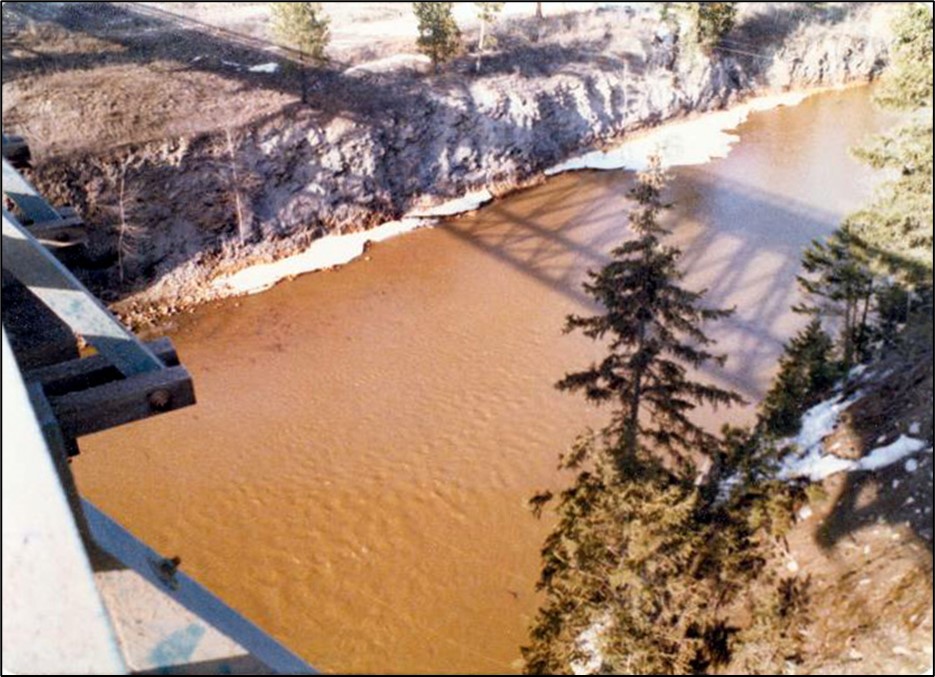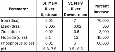 In rivers, the simplest way to gauge the impact of a waste discharge is to compare samples taken upstream with those from downstream of the point of discharge. Also, the greatest impact of a constant source of waste is when stream flows and dilution are at their annual lowest, typically March in the East Kootenays. The upstream sample site on the St. Mary River was located 1.2 river km above the Mark Creek confluence, and the downstream site was located at the Wycliffe Bridge, 8.5 river km downstream of Mark Creek. Many other sites were sampled, but these have the longest period of record. Downstream increases in metal and other contaminants were enormous, ranging from a 300 % increase in dissolved lead to a 70,000 % increase in dissolved iron.
