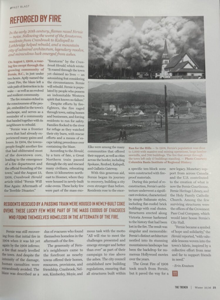 Past Blast Column: Reforged by Fire by Erin Knutson. It is an in-depth look at the Great Fire of 1908, in Fernie B.C., which united the communities of the East Kootenay and those across the border. Thank you, Kootenay Media, for featuring the Columbia Basin Institute of Regional History’s (CBIRH) images in this winter’s new edition!