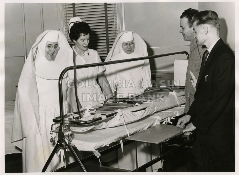 Demonstration of the new striker patient turning frame at the Mater Miscericordiae Hospital in Rossland, BC. January 23, 1958 L to R: Sister Angelo, Nurse Barge, Sister Helena, "Sandy" Gordon and President Andy Chapdelaine of the Kinsman Club (Kinsman gave $140.00 towards the purchase