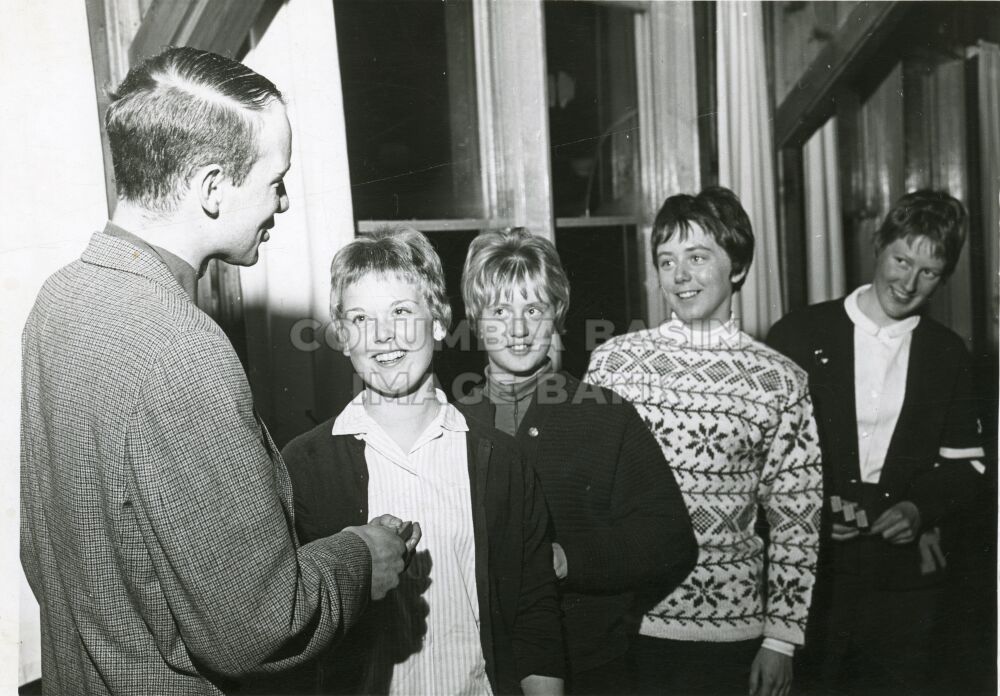 Presentation of Ski Medals in Rossland 1962: Don Sturgess, Monica Barrett, Judy Greene, Nancy Greene, Barbara Deane.
