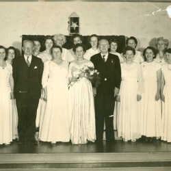 Installation of Rose Johnson as Worthy Matron of Harmony Chapter #45 Order of Eastern Star, Kimberley, B.C. Back row - left to right: Leona Downing, Iris Neve, Joan Barret, Flo Mason, Leona Schorlemer, Fran Miller, Dorothy Gaskell, Pearl Watson, Janet Weightman Front row - left to right: Barb Archibald, Bill Scholemer, Nancy Moss, Rose Johnson, Tom Dawson, Ina Medlicott, Bertha Eckford, Peggy Duncan