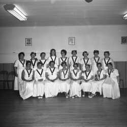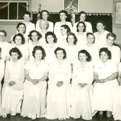 Kimberley, B.C., Rebekah Lodge Drill Team. Front row L to R: Grace (Siple) Leighton, Mrs. Jones, "Beenie" Robina Lilley, Betty Easton, Mable Glen, Mary McKay,Lila Bates. 2nd row L to R: Edna Oslie, Ivy Crossley, Rose Johnson, Inez Williams, Eppie Crowe, unknown, Mrs. McKay. 3rd row L to R: Eileen Brown, Mrs. Wormington, Helen Mawson, unknown, Mary Richards 4th row L to R: V. Schneider, Annie Walker, Myrtle Halmstrom, Della Mackie