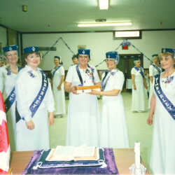 Order of the Royal Purple (O.O.R.P.). May Shaw receiving gavel at Gavel Drill April 15, 1989, District Meeting, Elks Hall, Kimberley, B.C.