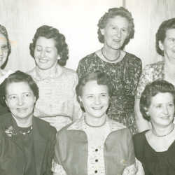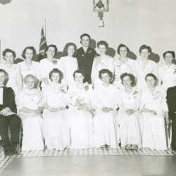 Kimberley, B.C., Harmony Chapter #45, Order of Eastern Star, 1949 Officers of the organization: Back row L to R: Nellie McLafferty, Faith Clinton, Pearl Watson, Dorothy Gaskell, Joan Barrett, Barbara Archibald, Ina Medlicott, Janet Wightman. Front row L to R: Jessie Sutherland, Margaret Duncan, Annie Moss, Edna Jones, Charlie Duncan, Rose Johnson, Leona Schorlemer, Bertha Eckford.