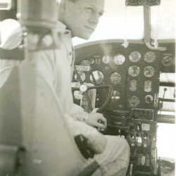 Gordon Fisher is seen in uniform in the cockpit of an airplane, around 1944.