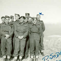 Photo of Paul Soderholm at military camp in Vernon, B.C. In the image, he is marked by the blue "X".