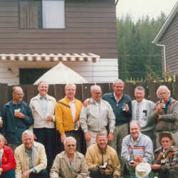 Kimberley, B.C., Pals Club Reunion, July 1987. In the image are: Back Row L to R: Glen Brown, Bill Poole, Harold McGowan, Mel Thompson, Chuck Kinrade, Bill Angove, Bill Herchemer, Nick Banks. Front Row L to R: Jack Hargreaves, Bob McKenzie, John Banks, George Eccleston, Jim O'Connor, Bill Irvine