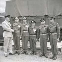 Image of six unidentified military men. One apears to be a commanding officer. The men look to be in the act of being recognized and are proudly displaying their military decorations. Who are these men?