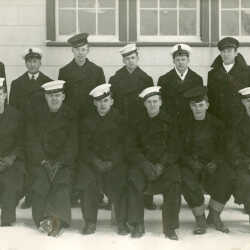 Sailors from Kimberley at HMCS Cornwallis, 1944: 1st Row - Joe Turner, Murray McKenzie, John McGregor, Larry Musser, Philip McKim, Fred McKim. 2nd Row - Percy Moody, Hunter McLure, Michael Diduck, Ron Hutchinson, Eddie LaFortune, Tom McCormick.