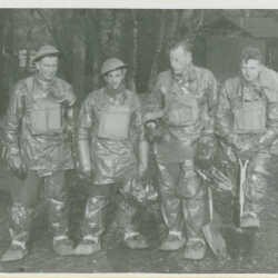 Four men from the 108th Fd. Bty. R.C.A. suited up for gas training in England. 2nd from left is Jim Brown.