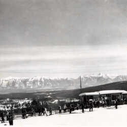 Looking east from Kimberley's North Star ski hill, with a line-up of people at the chair lift.