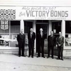 Tom Martin (Insurance) - Bill Clark (Federal Life Insurance) - unknown - Stan Norton (Agencies) and unknown Standing under a banner that reads "Help finish the job! Buy VICTORY BONDS District Headquarters".