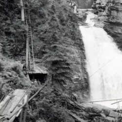 The old Mark Creek Falls. Unknown boy at landing and man at rock face.