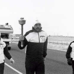 Bob Gyurkovits (Mine Foreman) in 1988 carrying the Olympic Torch as it made its way to the 1988 Calgary Olympic Winter Games.