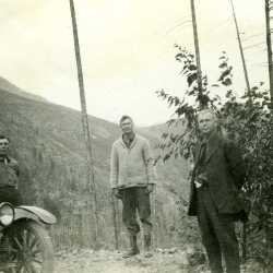 On the Narrow Gauge road at Bull River in August 1923. Identified are: Dave Black, Pete Marchinik, Dave Harrie, and "Henry" (the car?). The Narrow Gauge was road running alongside the Bull River Canyon, famous for its narrowness and the long fall off the side. It provided accress to some of the best fishing.