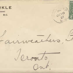 Bull River, envelope from B.E. Markle, General Merchant addressed to Toronto, with a Bull River postal CDS Oct.10, 1927, envelope front.