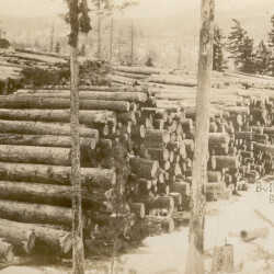 Unused sepia real photo postcard of stacked cut logs near Bull River, BC. AZO stampbox style in use 1904-1918.
