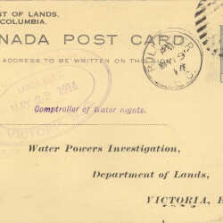 Bull River, BC Dept. of Lands, Water Powers Investigation - Gauge Readers Weekly Report. Bull River postal cancel CDS May 19, 1914, postcard front.