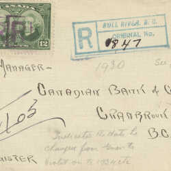 Bull River registered cover to Canadian Bank of Commerce, Cranbrook, B.C., envelope front.