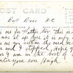 "The Camp" Bull River B.C. c.1921 Written of back: "Here is one for Father too, this is the just camp. I was at up here it is only a small one, the one you see first in the card in where the boss and I stopped, Hope you are well, as I am in the best of health all winter your son, Hugh"
