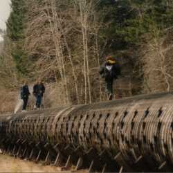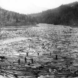 Logging engineers DeWolf and Ham have 60 men constructing a dam at Bull River to be blown up during filming of "Timber"