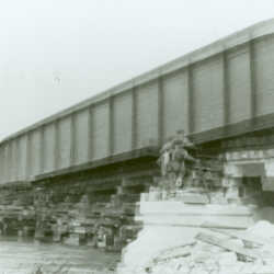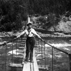 A cable foot bridge crossing the Bull River near Iron Creek, 1928. Herbert Neily on bridge. This bridge was used by fishermen and hunters long after the loggers left the area.