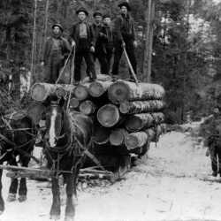 "A good average load of logs for the loading crew and the slippery mountain roads." Two horse team hitched to a sloop with a good load of logs with five loggers posed on top, 1915.