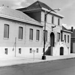 Photo of Cranbrook's City Hall in its present configuration but before the Knights of Pythias Hall (to the south) was torn down.