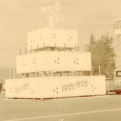 Birthday Cake constructed in 1955 out of plywood for Cranbrook's Golden Jubilee. It stood at the corner of Baker and Van Horne Streets. Note the key symbol on the top of the cake.