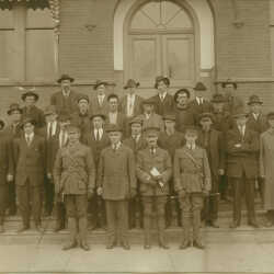 World War I Recruits on steps of City Hall, Cranbrook, B.C. - 1914. A portion of the "Recruiting" sign is visible, and the recruiters are in uniform.