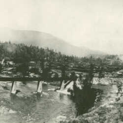 Train wreck at the Corra Linn Dam, just out of Nelson, B.C., Sept. 20, 1936. The wreck involved a westbound passenger train #12 and eastbound train #11. Photo was taken by Mr. MacDonald from the power plant and a crowd of people on hillside opposite is visible.
