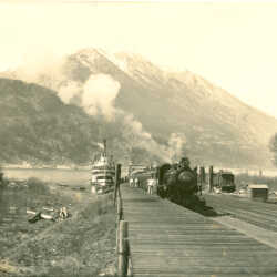 S.S. Nasookin & passenger train with locomotive #566 at the Kootenay Landing slip.