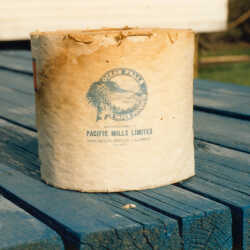 A roll of toilet paper manufactured by Ocean Falls Paper Company, Vancouver, British Columbia Canada.