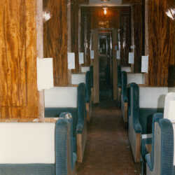Interior view during restoration of the rail coach 'Rutherglen'; view to B-end along sections, March 1985. A portion of the collection of the Canadian Museum of Rail Travel.