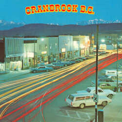 Cranbrook, B.C. at night, photo by E. Anderson. This view shows the business block anchored by the Imperial Bank building before the Commercial Hotel was torn down and the buildings destroyed to put in the 9th Avenue connector.