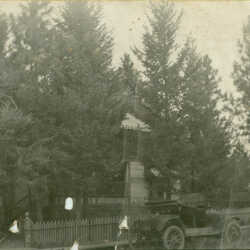 An early automobile parked on the corner of 13th Avenue & 2nd Street South in Cranbrook.