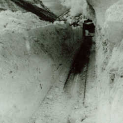 The Frank and Grassy Mountain Railway at Lille, Alberta (north of Blairmore, Alberta). The abandoned car has Charlie Drain standing on the steps.