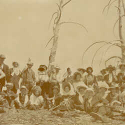 A large group of people reported to be mountain climbing near Cranbrook on July 1, 1909. Dan Melody adds: The narly trees in the back ground are consistent to the ones found on top of Cranbrook Mountain, South of the city towards Moyie/Gold Creek area.