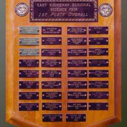 Trophy exhibiting all East Kootenay Regional Science Fair - Overall 1st Place contestants. The List includes: 1986 Jon Bjorgan; 1987 Tod Ratson; 1988 Heidi Brown; 1989 Viveka Johnson; 1990 Stephen Barclay; 1991 Clayton Lauritzen; 1992 Stuart Rae; 1993 Matt Kitt; 1994 Jeff Faulks; 1995 Amberly Bailey-Romanko; 1996 Amberly Bailey-Romanko; 1997 Amberly Bailey-Romanko; 1998 Amberly Bailey-Romanko; 1999 Amberly Bailey-Romanko; 2000 Behruz Aryan; 2003 Katie Kotlarz; 2004 Olin Bjarnason; 2005 Katelyn Knudsgaard; 2006 Fern Leavens / Carly Proudfoot; 2007 Fern Leavens / Carly Proudfoot; 2008 Curtis Hall; 2009 Keltie Murdoch; 2010 Keltie Murdoch; 2011 Keltie Murdoch / Mathew Lavery; 2012 Keltie Murdoch; 2013 Rosaele Tremblay; 2014 Briana Leriche; 2015 Rory Smith; 2016 Rory Smith; 2017 Rory Smith; 2018 Rory Smith; 2019 Tanner Eckersley; 2020 Braxton Chan; 2021 Braxton Chan.